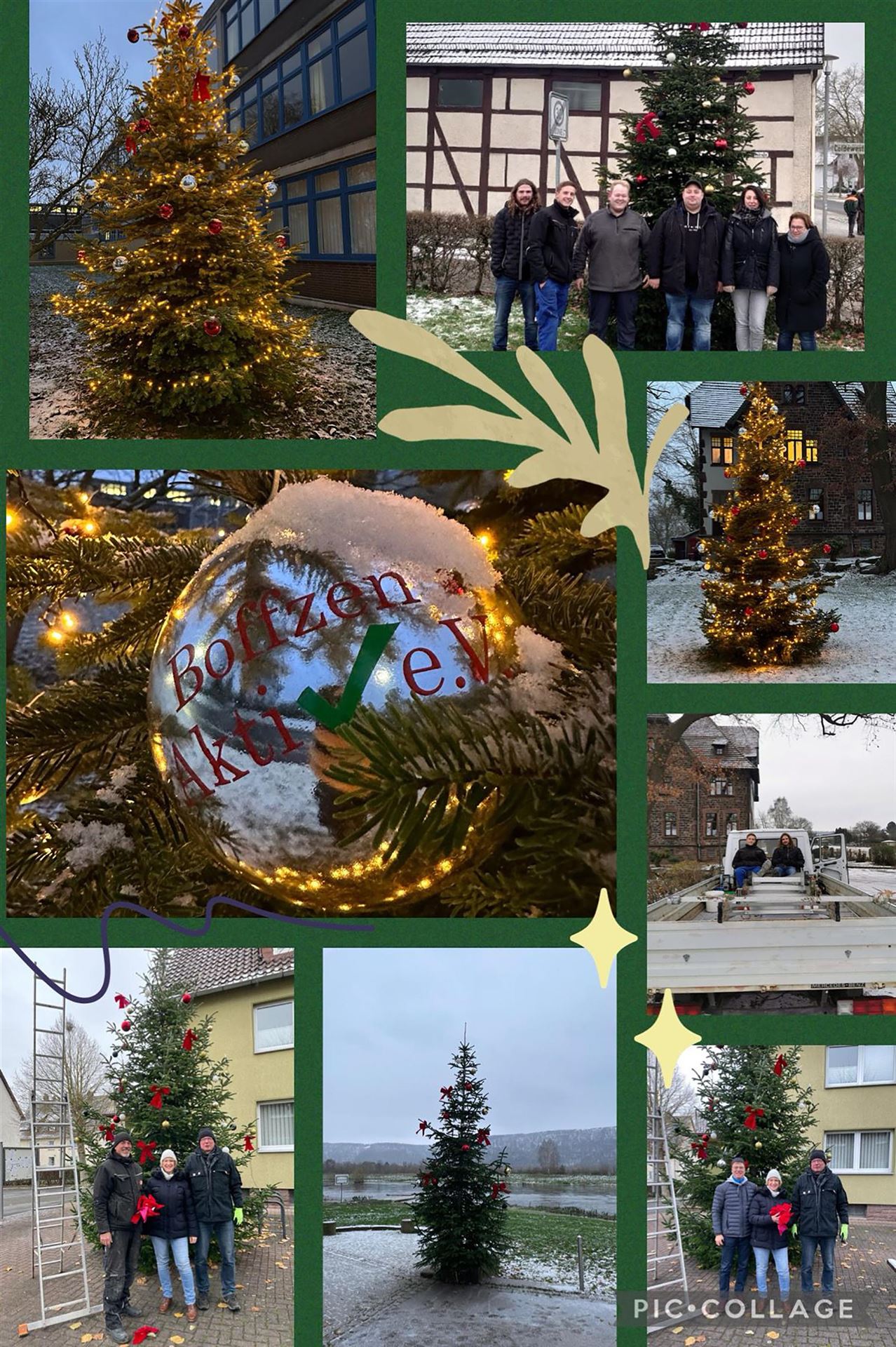 Der Verein Boffzen Aktiv e.V. hat in diesem Jahr wieder mehrere Weihnachtsbäume im Ort aufgestellt und mit Beleuchtung und Kugeln geschmückt. Sogar selbstgestaltete Weihnachtskugeln hängen an den Bäumen.